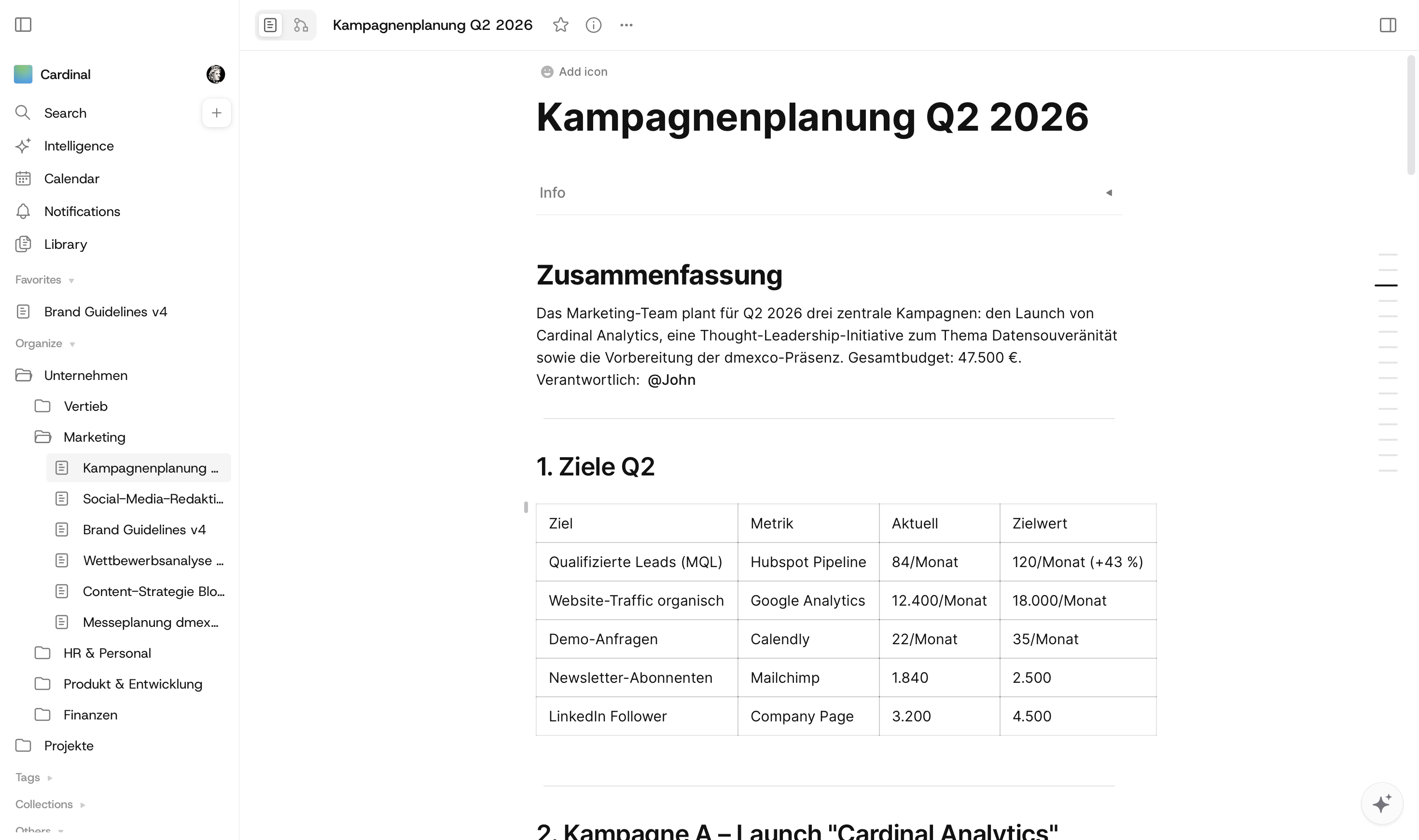 Das Marketing-Team plant für Q2 2026 drei zentrale Kampagnen: den Launch von Cardinal Analytics, eine Thought-Leadership-Initiative und die dmexco-Präsenz.